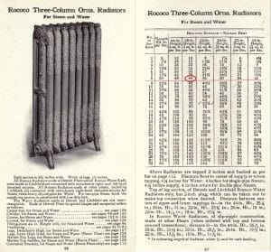 Dans le tableau ci-bas on constate que pour le même radiateur; Rococo de 38 pouces de haut et 3 colonnes, nous avons une puissance de 240 watts par section.