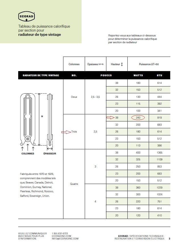 Dans le tableau ci-bas on constate que pour le même radiateur; Rococo de 38 pouces de haut et 3 colonnes, nous avons une puissance de 240 watts par section.