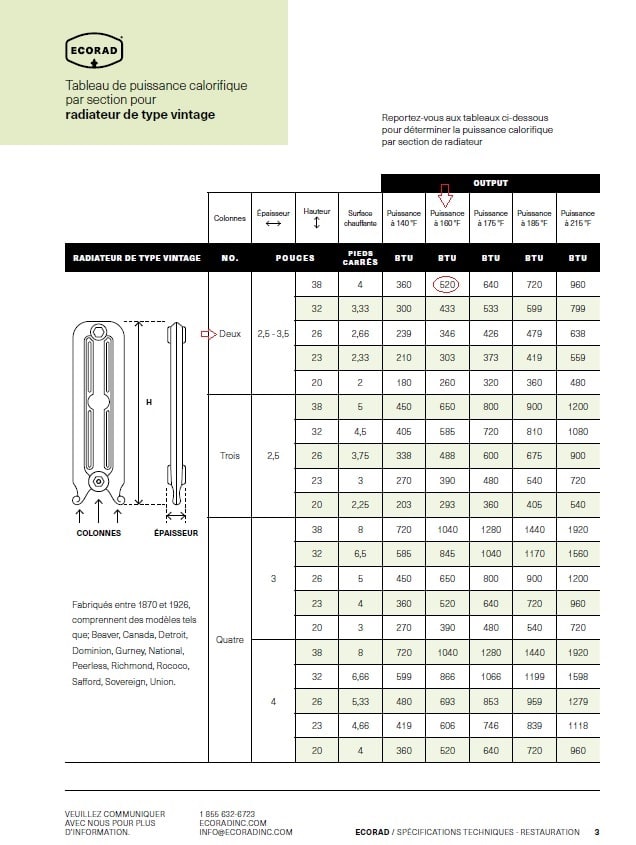 Pour simplifier ce processus, Ecorad a compilé les données historiques de plusieurs fabricants de radiateurs dans des tableaux. Ces tableaux indiquent l’équivalent en BTU à différentes températures d’eau de fonctionnement par section du radiateur.