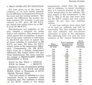 La puissance calorifique des radiateurs en fonte, historiquement appelée rayonnement direct équivalent (RDE), en anglais « Equivalent Direct Radiation (E.D.R.)» dépend de la température de l’eau qui les traverse. Consultez le tableau ci-dessous, extrait de l’ouvrage « Short Course in Modern Heating » de Garnet H. Hopper, publié par AGE Publication LTD en 1951, pour connaître la puissance calorifique émise en BTU à une température d’eau donnée.