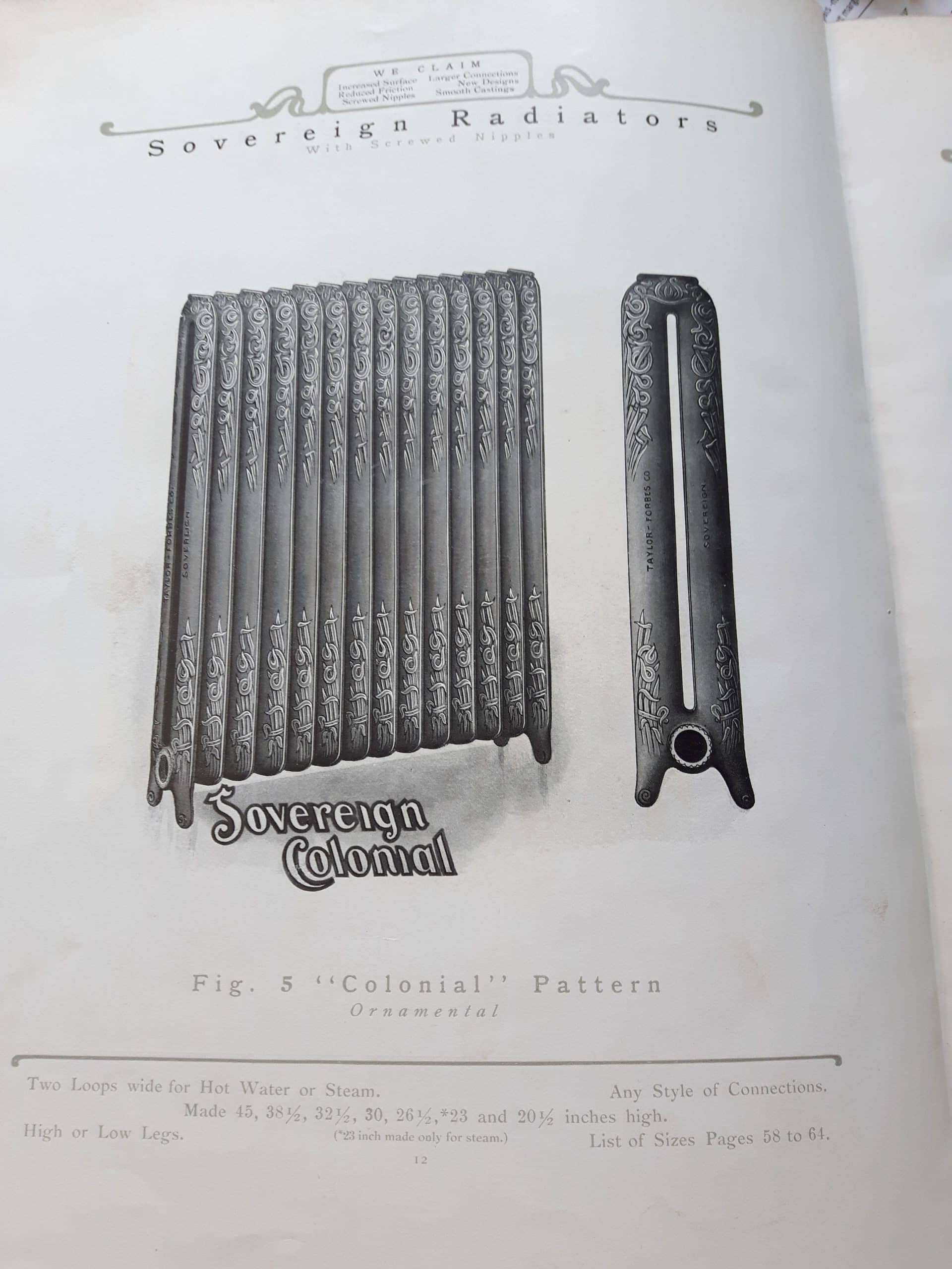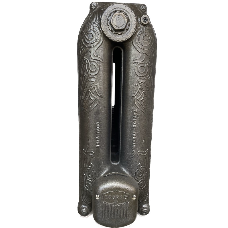 This model was manufactured in Canada by Taylor Forbes CO. The head of the radiator has small ears and the design shows swirls on top and at bottom of legs.